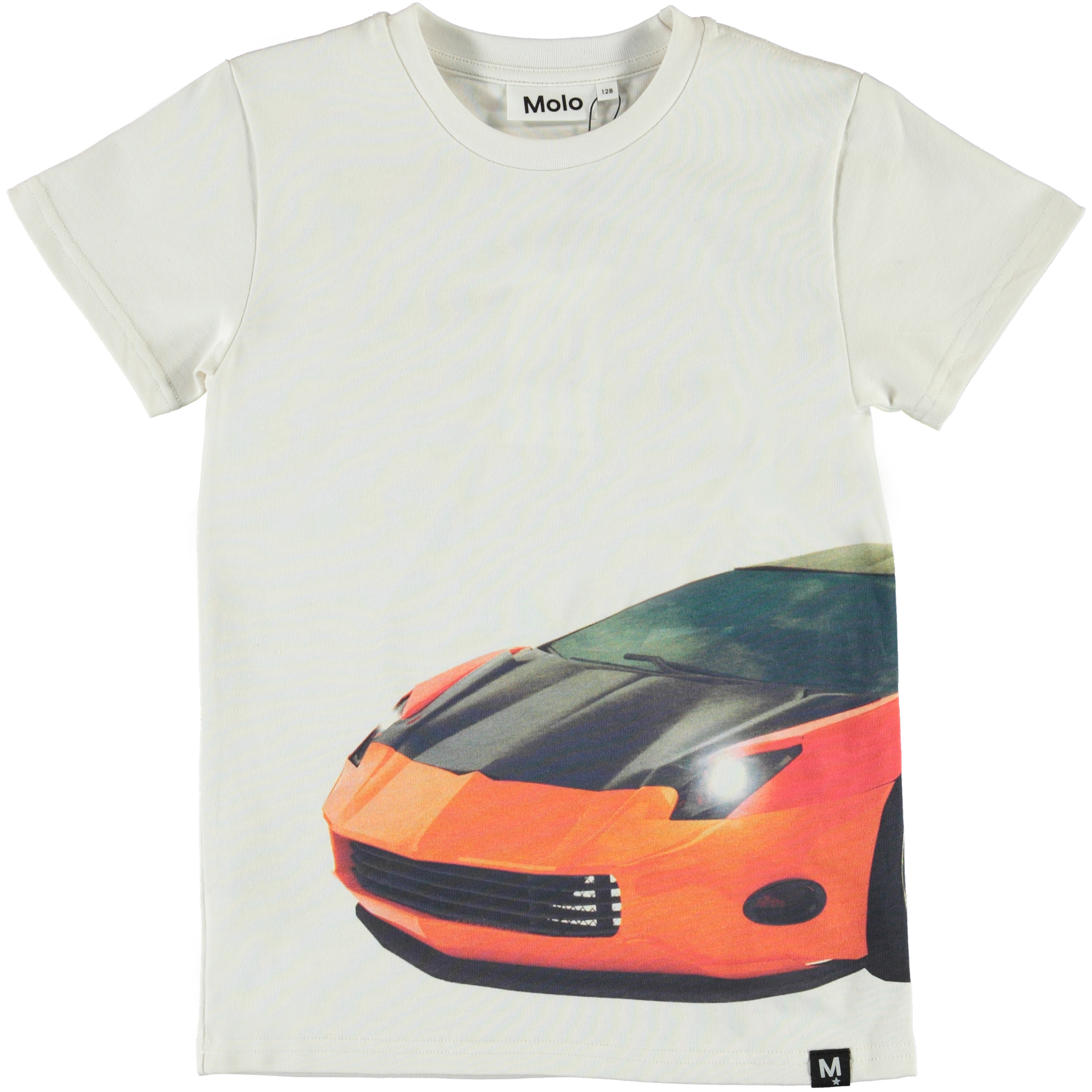 Bli lite snabbare med Raven, som är en vit t-shirt med tryck på sidan av en snabb bil. Raven är i 100% bomull och har korta ärmar.