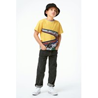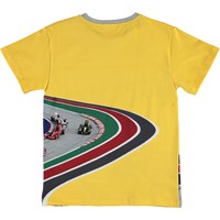 Tävlingsbilarna på den gula t-shirten Raveno kör med kraftig fart. Printet på t-shirten fortsätter på ryggen.