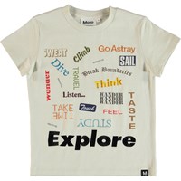 Raymont är en bomulls t-shirt i bruten vit med många budskap i olika stilsorter. Det är både tryckt och broderad text.