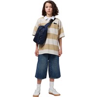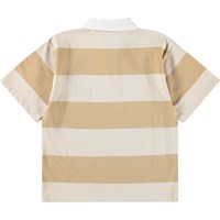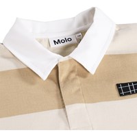 Pikétröja i mjuk, ekologisk bomull med ribbade kanter, vit skjortkrage och en liten knappslå med tre dolda knappar. Pikén har en normal passform med horisontella breda ränder i beige och vitt med Molos logotyp på bröstet.