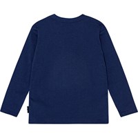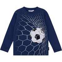 Mörkblå tröja i ekologisk bomull med långa ärmar, rund hals med ribbad kant och normal passform. Den har ett tryck på framsidan som visar ögonblicket när en fotboll zoomar in i nätet och du gör mål!