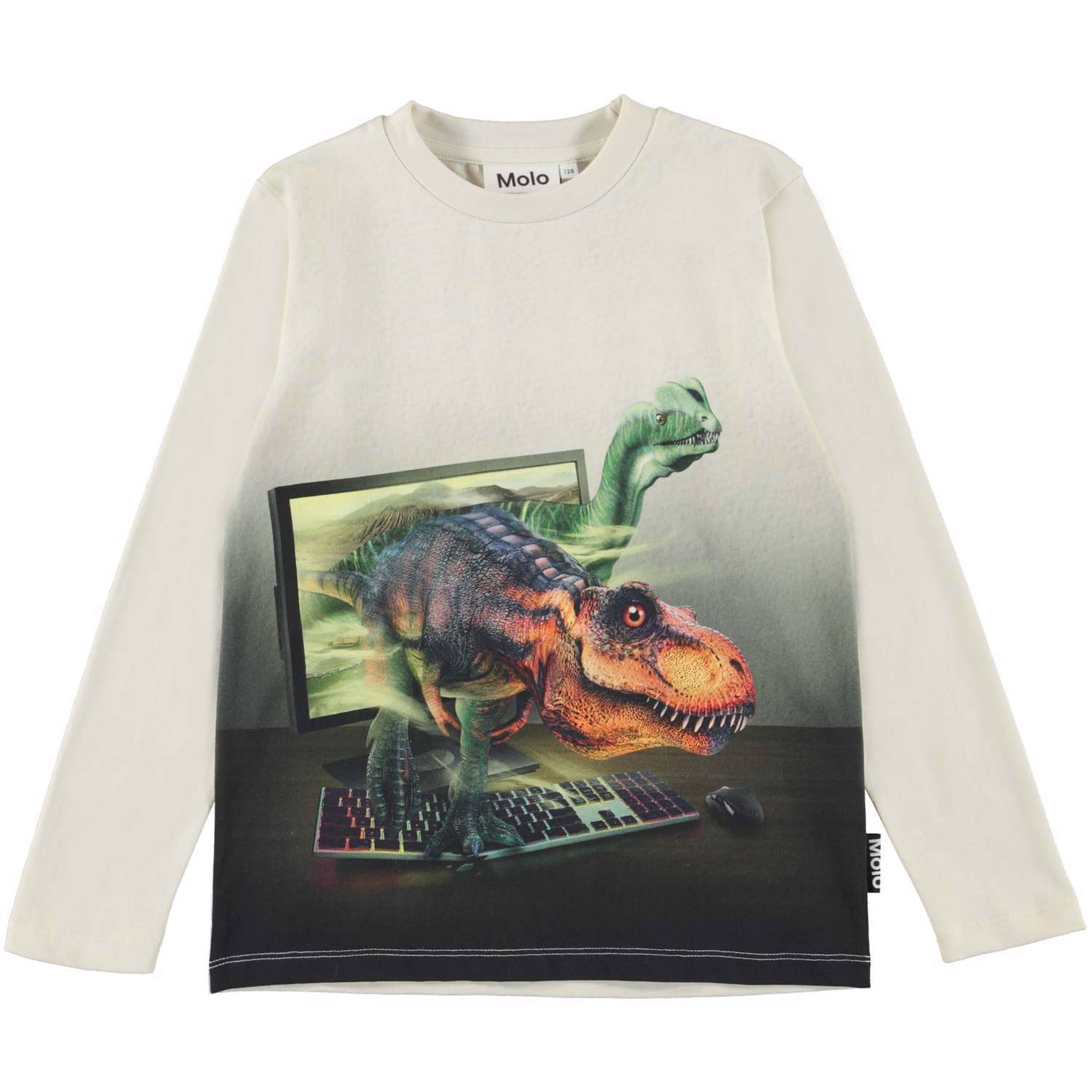 Dåtid och nutid möts på denna långärmade T-shirt Reif, där dinosaurier är på väg ut från spelet och direkt ut från din datorskärm. Mönstret heter "Hello Dino" och är framtill på denna långärmade T-shirt, Reif, där rygg, hals och baksida är vit.