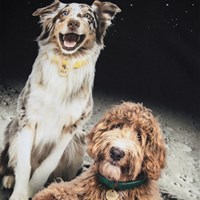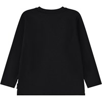 Svart långärmad tröja i mjuk ekologisk bomull med långa ärmar och en ribbad halsringning. Tröjan har en lös passform med två glada hundar på månen.