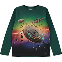 Grön långärmad t-shirt med UFO´s som flyger snabbare än ljusets hastighet. Se upp för alla farorna där ute! Man ska vara en duktig alien för att kunna flyga säkert igenom asteroidbältet. Mönstret är i klara regnbågsfärger. Denna långärmade t-shirt är tilverkad i 100% ekologisk bomull, har rund hals med ribbkant, ribbkant vid ärmslut och höfter, samt en normal passform.