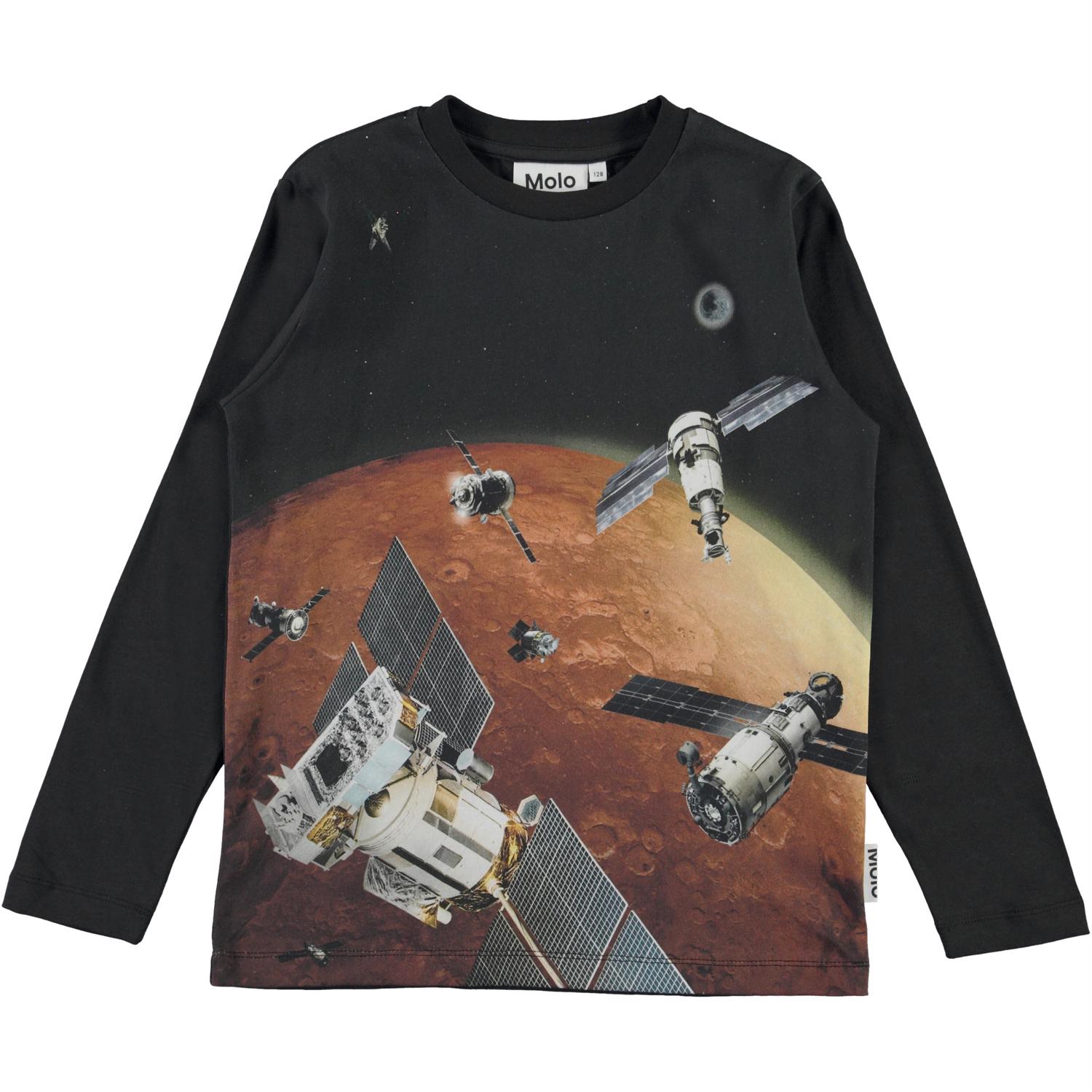 Reif är en svart långärmad tröja med ett tryck av satelliter som kretsar runt rummet.