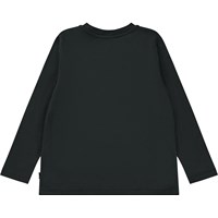 Svart långärmad t-shirt där forntid och framtid möts. På himlen ses rymdskepp, stjärnor och planeter, medan på jorden ses en tyrannosaurus som doppar sin tår i en stilla sjö. Kanske kan vi i framtiden resa i tiden så att turister kan ta en tur till krittiden? Denna långärmade t-shirt är tilverkad i 100% ekologisk bomull, har rund hals med ribbkant, ribbkant vid ärmslut och höfter, samt en normal passform.