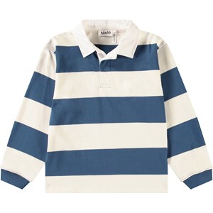 Bredrandig blå och vit rugbytröja i mjuk ekologisk bomull. Tröjan har en normal passform, långa ärmar med ribbade muddar, en vit skjortkrage och en liten knappslå med tre dolda knappar, vilket gör den lätt att ta på sig.