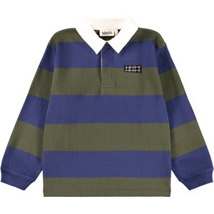 Bredrandig blå och mörkgrön rugbytröja i mjuk ekologisk bomull. Tröjan har en normal passform, långa ärmar med ribbade muddar, en vit skjortkrage och en liten knappslå med tre dolda knappar, vilket gör den lätt att ta på.