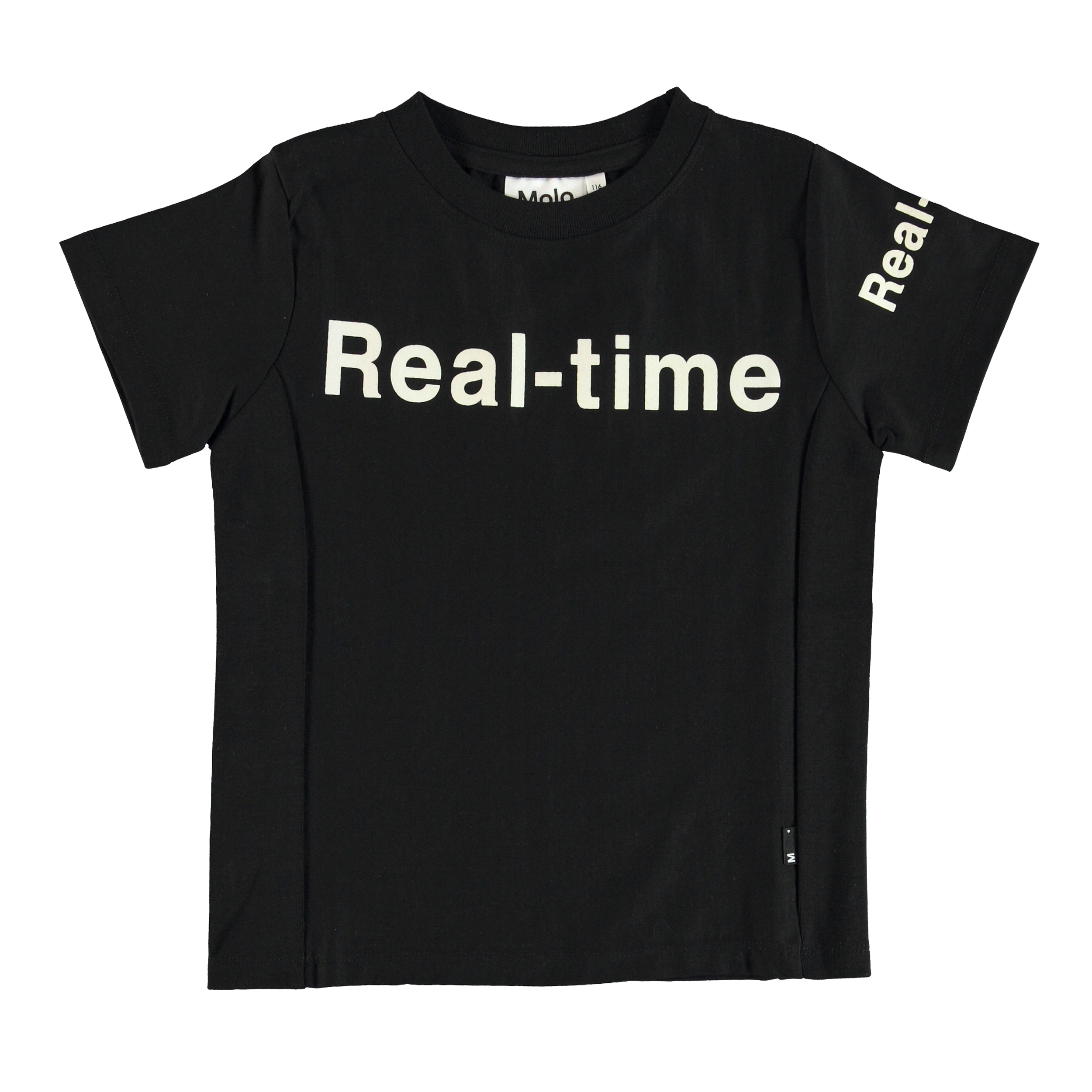 Rem är en lätt figursydd bomulls t-shirt i svart med "Real-time" trycket över bröstet och på vänster ärm i vit.