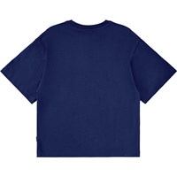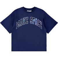 Mörkblå T-shirt i ekologisk bomull med korta ärmar och en rund, ribbad halsringning. T-shirten har en oversized passform med texten "Make Space" framtill.