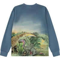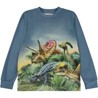 Blå långärmad t-shirt med mönster både fram och bak. Här används levande och klara färger och alla dinosauriervännerna står och tittar nufiket åt samma håll. På ärmen har de fått syn på något nytt - är det en ny art? Kanske är det dem som kommer ta över jorden efter dinosurierna? Kanske kan de känna en ny era flåsa dem i nacken? Denna långärmade t-shirt är tilverkad i 100% ekologisk bomull, har rund hals med ribbkant, ribbkant vid ärmslut och höfter, samt en normal passform.