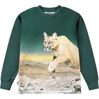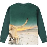 Grön tröja i ekologisk bomull med långa ärmar, rund hals och ribbstickad kant vid hals och ärmar. Tröjan har en normal passform med ett tryck på både fram- och baksidan, som visar en puma som jagar på de vida slätterna.