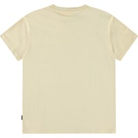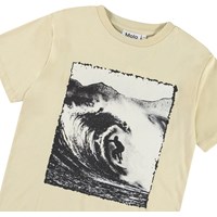 Beige t-shirt i mjuk ekologisk bomull med korta ärmar och ribbad halsringning. T-shirten har en lös passform med en surfare på vågen i svart och vitt.