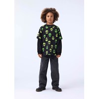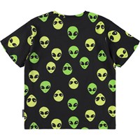 Svart T-shirt i mjuk ekologisk bomull med korta ärmar och en ribbad halsringning. T-shirten har en lös passform med neon gula och gröna utomjordiska ansikten.