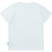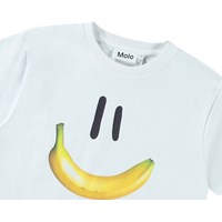 Vit t-shirt i mjuk ekologisk bomull med korta ärmar och ribbad halsringning. T-shirten har en lös passform och ett leende ansikte med en bananmun.
