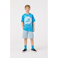 Blå t-shirt i mjuk ekologisk bomull med korta ärmar och ribbad halsringning. T-shirten har en lös passform med splash-bild och en surfare på vågen.