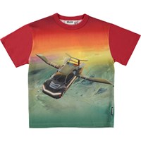 Riley är en röd t-shirt med en flygande bil framtill och på baksidan ser man bilen och några rymdskepp.