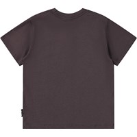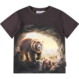 Mörkbrun T-shirt i mjuk ekologisk bomull med korta ärmar och en ribbad halsringning. T-shirten har en lös passform med en björngrotta med en mamma-björn och hennes ungar.