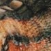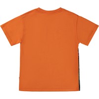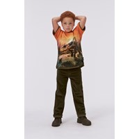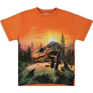 Orange t-shirt med dinosauriemönster. Här ser man en T-rexlura runt en sjö, kanske på jakt efter sitt nästa byte. Denna t-shirt är tillverkad i 100% bomull, har korta ärmar, rund hals med ribbkant och lös passform.