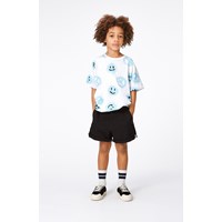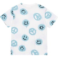 Riley är en vit t-shirt med blått och svart mönster, tillverkad i 100% ekologisk bomull. Mönstret består av av massa spraymålade peacetecken och smileys som tillsammans sprider budskapet "More Love". Riley har en rund hals med ribbkant och en lös passform.