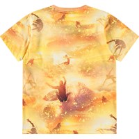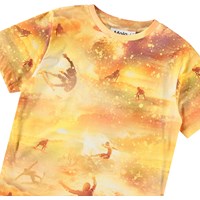 T-shirt i gula och orange nyanser i mjuk ekologisk bomull med korta ärmar och ribbad halsringning. T-shirten har en lös passform och ett mönster av surfare i rörelse.