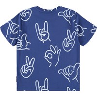 Blå T-shirt i mjuk ekologisk bomull med korta ärmar och en ribbad halsringning. T-shirten har en lös passform med en vit handritad handgest.