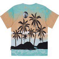 Riley är en t-shirt, med mönster framtill, i 100% ekologisk bomull. Mönstret är ett klassiskt Hawaii motiv i svart, turkos och sandfärgade toner, med palmer framför en solnedgång. Denna t-shirt har en rund hals med ribbkant och en lös passform.