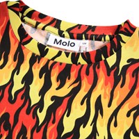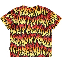 Gul, svart och röd T-shirt med flammor, tillverkad av mjuk ekologisk bomull, har en ledig passform med korta ärmar och en ribbad halsringning.