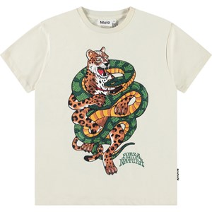Off-white t-shirt i mjuk ekologisk bomull med korta ärmar och ribbad halsringning. T-shirten har en lös passform och en färgglad främre bild av en jaguar insvept i en orm och texten 'Forza Della Natura'.