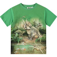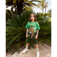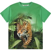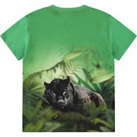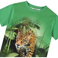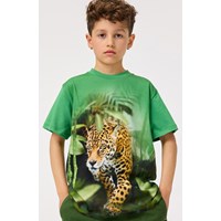Grön t-shirt i mjuk ekologisk bomull med korta ärmar och ribbad halsringning. T-shirten har en lös passform med en gepard i djungeln, som fortsätter på baksidan med en svart lurande gepard.