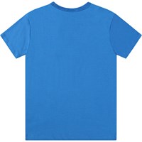 Blå T-shirt i ekologisk bomull med korta ärmar och rund hals med ribbstickad kant. Den har en lös passform och ett litet placerat tryck på framsidan, som visar ett gult, leende pixelansikte.