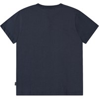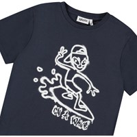 Mörkblå t-shirt i mjuk ekologisk bomull med korta ärmar och ribbad halsringning. T-shirten har en lös passform med en graffiti-målad alien på en surfbräda och texten 'On A Wave'.