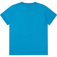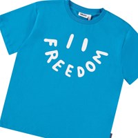 Blå t-shirt i mjuk ekologisk bomull med korta ärmar och ribbad halsringning. T-shirten har en lös passform och ett leende ansikte och en mun med ordet "Frihet".