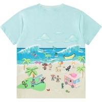 Ljusblå t-shirt i mjuk ekologisk bomull med korta ärmar och ribbad halsringning. T-shirten har en lös passform med ett pixlat mönster av den verkliga världen, roliga karaktärer från Molos kollektioner och massor av spännande berättelser som är roliga att utforska i det färgglada universumet.