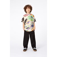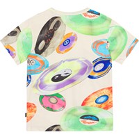 Riley är en beige t-shirt med multifärgat mönster i 100% ekologisk bomull. Här ses fina och färgstrålande vinylskivor som svävar runt på en ljus bakgrund. Riley har en rund hals med ribbkant och enlös passform.