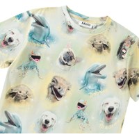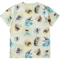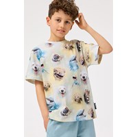 Beige och ljusblå t-shirt i mjuk ekologisk bomull med korta ärmar och ribbad halsringning. T-shirten har en lös passform och ett mönster av söta och leende djur.