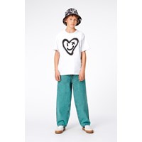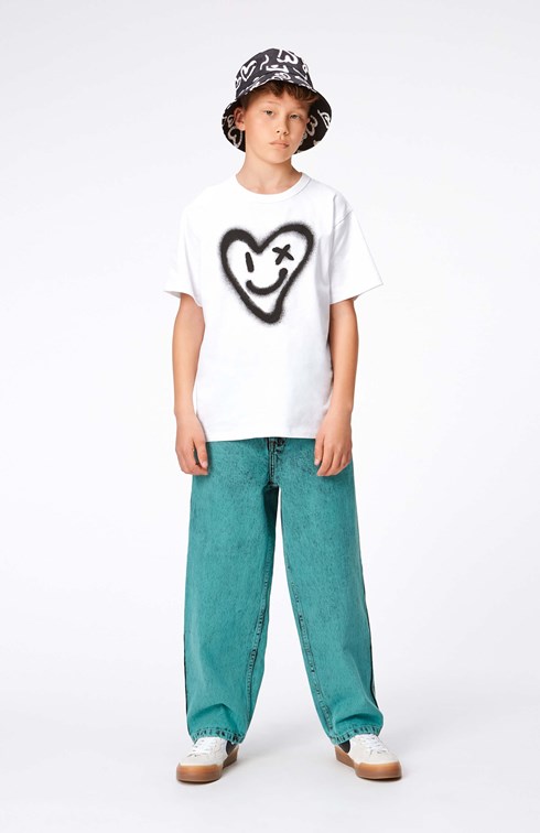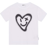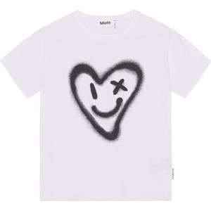 Riley är en vit t-shirt med mönster framtill i 100% ekologisk bomull. Framtill är det ett stort, spraymålat, hjärta som ler och blinkar till dig. Riley har rund hals med ribbkant och en lös passform.