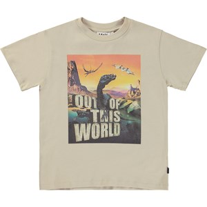 Beige t-shirt med rymdskepp som landar på dinosauriernas planet. Denna t-shirt är tillverkad i 100% bomull, har korta ärmar, rund hals med ribbkant och lös passform.