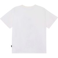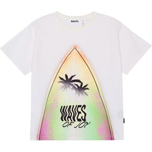 Riley är en vit t-shirt i 100% ekologisk bomull. Här ses toppen av en surfbräda, spraymålad i färgerna lila, limegrön, gul, en palm och texten "Waves of Joy". Riley har en rund hals med ribbkant och en lös passform.