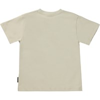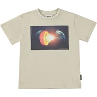 Riley är en beige t-shirt med en bild av jordklotet, från ytan och ner till kärnaan.