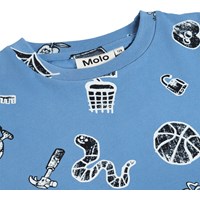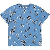 Blå T-shirt i mjuk ekologisk bomull med korta ärmar och ribbad halsringning. T-shirten har en lös passform med svartvita motiv.