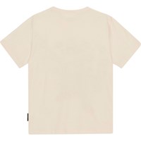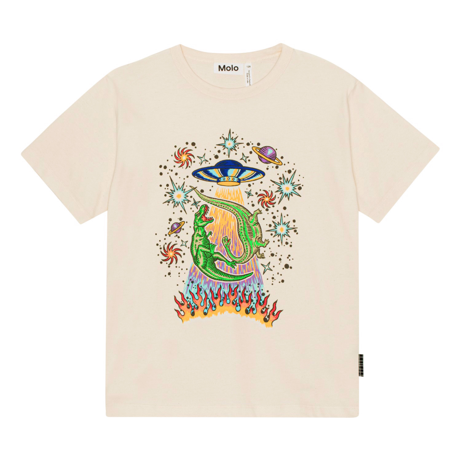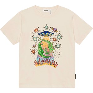 Riley är en ljus ofärgad t-shirt med mönster framtill, i 100% ekologisk bomull. Här är mönstret har konstnärlig fantasi fullt ut. Här finns allt, dinosaureier som sttrålas upp i UFO, stjärnor, planeter och eldlågor. Riley har rund hals med ribbkant och en lös passform.