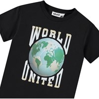 T-shirt i mjuk ekologisk bomull med korta ärmar och ribbad halsringning. T-shirten har en lös passform och en bild av en ljusblå fotboll med en världskarta och texten 'World United'.