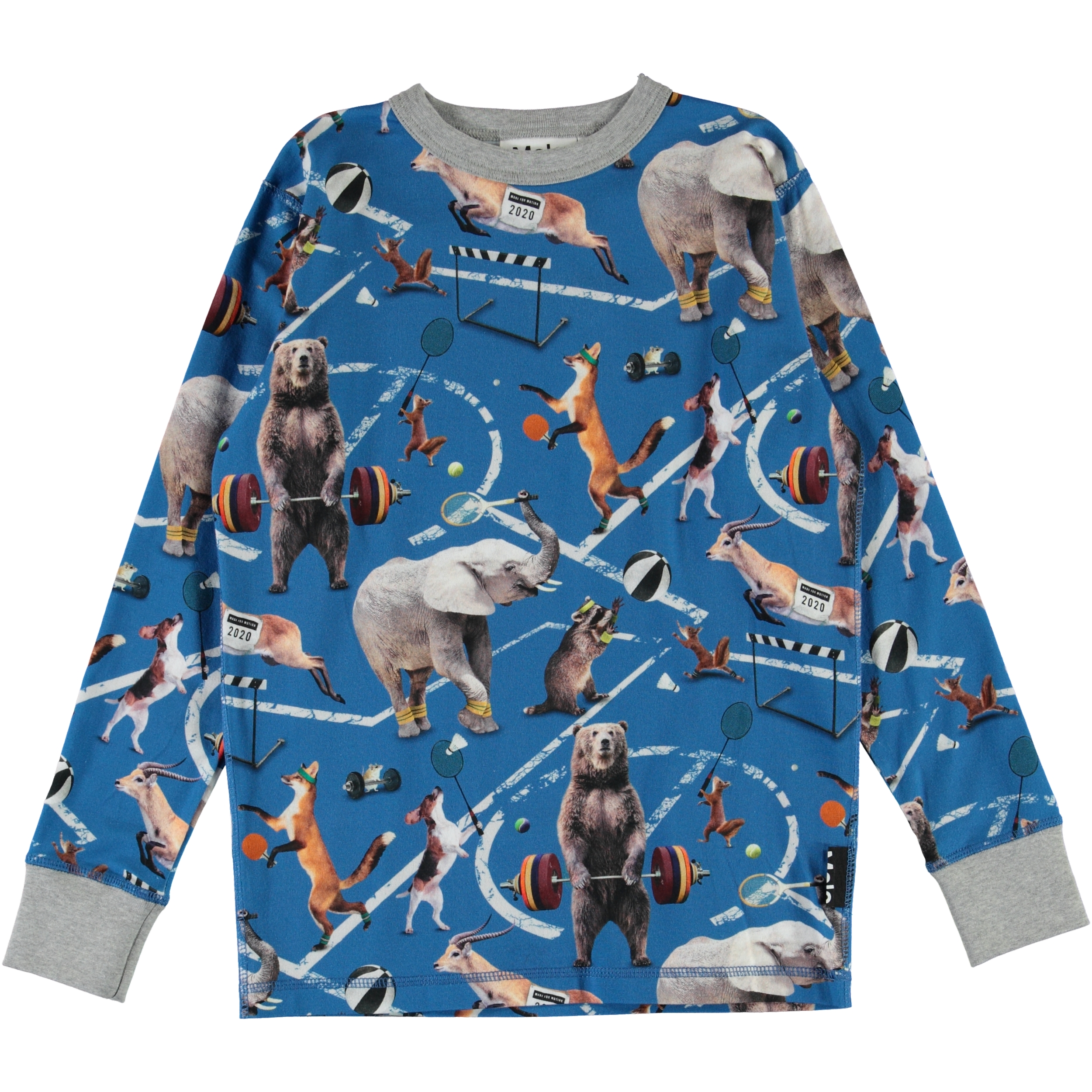Rill är en ljusblå långärmad t-shirt med ett all-over tryck av coola djur som utövar olika sporter. Rill har ett grått kantband vid urringningen samt en grå ribbkant vid ärmens slut.