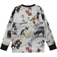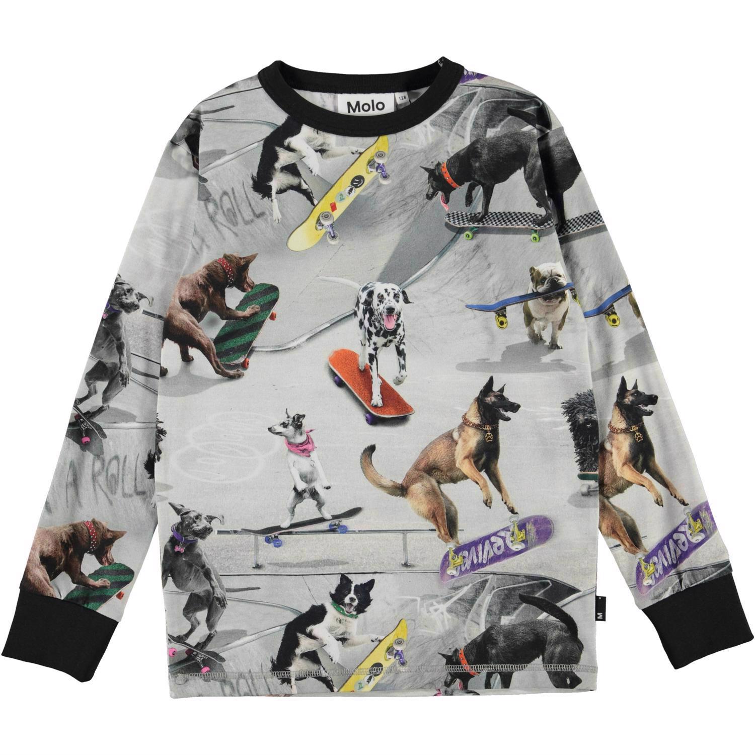 Har du någonsin funderat över vad hundar gör när de är ensamma? Kanske ses de nere på rampen och skater runt tillsammans på deras skateboards. Det gör de i varje fall på den långärmade T-shirten Rill i mönstret "Doggy Town".