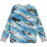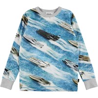 Blixtsnabba speedbåtar susar över det krtistallblå havet, på den långärmade T-shirt, Rill. På Rill är mönstret "Electric Speed", där man känner farten i vinden i håret när båtarna susar förbi.