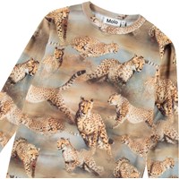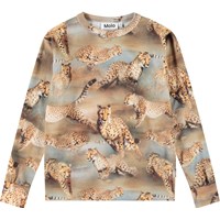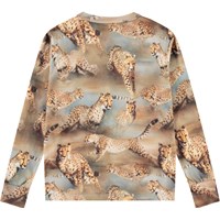 Långärmad topp i mjuk ekologisk bomull med ribbad kant vid halsen och ärmarna. Toppen har en normal passform i nyanser av brunt och blått med geparder i full fart.
