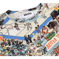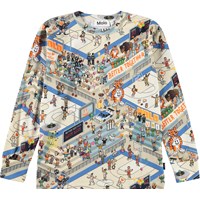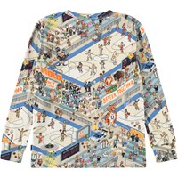 Långärmad tröja i mjuk ekologisk bomull med ribbade kanter runt halsen och ärmarna. Tröjan har en normal passform med ett pixlat mönster av basketplaner och roliga figurer.