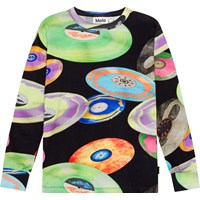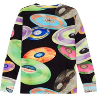 Rill är en svart långärmad tröja med mönster, i 100% ekologisk bomull. Här ses fina färgrika vinylskivor, svävande runt på den svarta bakgrunden. Rill har en rund hals med ribbkant, ribbkant vid ärmarna och en normal passform.
