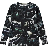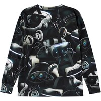 Svart tröja i ekologisk bomull med långa ärmar med ribbade muddar och ribbad hals. Tröjan har en normal passform och ett mönster över hela ytan inspirerat av virtuell verklighet, särskilt VR-glasögon, som kan transportera dig till en helt annan värld.